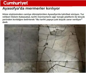 Επιπλέον, η ξεναγός Özlem Kabasakal, μιλώντας στην εφημερίδα Cumhuriyet, ισχυρίστηκε ότι έχουν σπάσει και τα ιστορικά μάρμαρα του δαπέδου εξαιτίας μηχανήματος καθαρισμού μεγάλου βάρους.