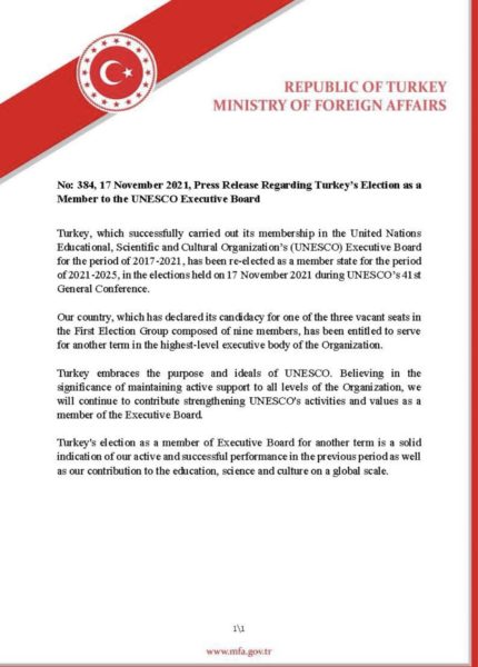 Στη ψηφοφορία που διεξήχθη στο πλαίσιο της 41ης Γενικής Διάσκεψης της UNESCO, στις 17 Νοεμβρίου 2021,η Τουρκία επανεξελέγη για μία ακόμη τετραετία ως μέλος του Εκτελεστικού Συμβουλίου της UNESCO, του Εκπαιδευτικού, Επιστημονικού και Πολιτιστικού Οργανισμού των Ηνωμένων Εθνών για την περίοδο 2021-2025.