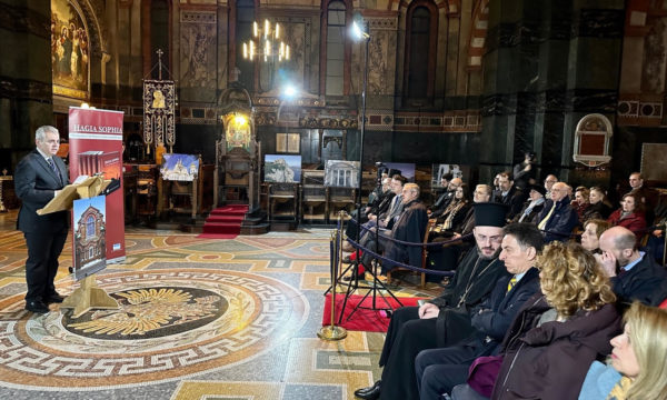 Ο Μάξιμος Χαρακόπουλος «ξεδιπλώνει» την καμπάνια της ΔΣΟ για την Αγιά Σοφιά στον καθεδρικό Ναό της Αγίας Σοφίας στο Λονδίνο