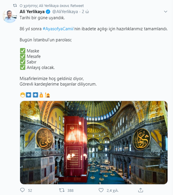 “Η Αγία Σοφία είναι έτοιμη για την πρώτη μουσουλμανική προσευχή σήμερα” ανέφερε σε μήνυμά του ο νομάρχης της Κωνσταντινούπολης, Αλί Γιερλικάγια, ενώ ο Αλί Ερμπάς σηματοδοτώντας τη λήξη των εργασιών