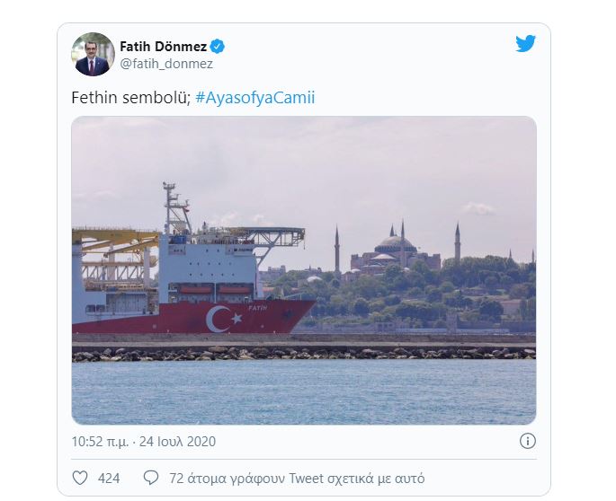 Μια φωτογραφία με φόντο την Αγία Σοφία και μπροστά της, στη θάλασσα, το τουρκικό πλοίο-γεωτρύπανο «Fatih», που σημαίνει Πορθητής, δημοσιοποίησε ο υπουργός Ενέργειας της Τουρκίας, Φατίχ Ντονμέζ, στο Twitter, λίγο πριν την πρώτη μουσουλμανική προσευχή στην Αγία Σοφία έπειτα από 86 χρόνια.
