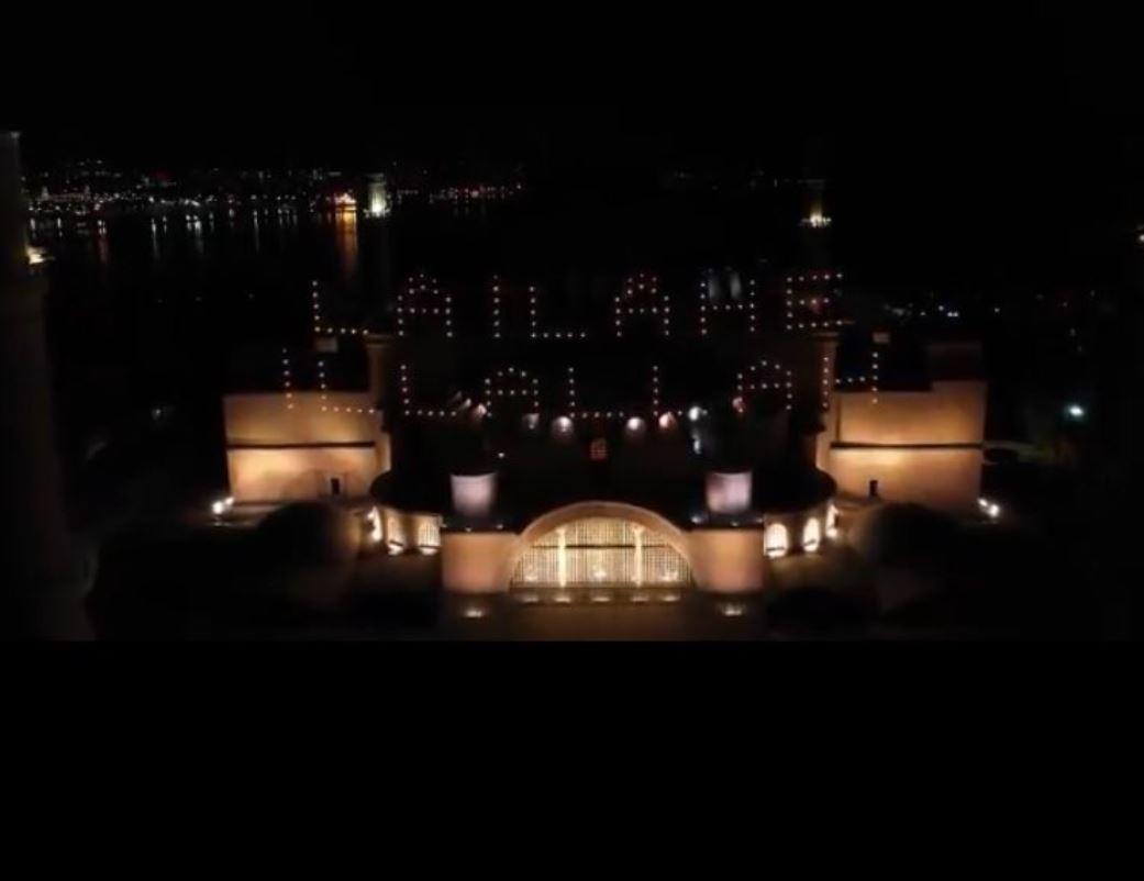 Συγκεκριμένα, το Σάββατο 8 Μαΐου 2021, με πρόφαση θρησκευτικούς εορτασμούς, οι τουρκικές αρχές τοποθέτησαν για πρώτη φορά φωτεινή επιγραφή με την φράση «Δεν υπάρχει άλλος θεός, εκτός από τον Αλλάχ» ανάμεσα στους δύο μιναρέδες που χτίστηκαν επί Οθωμανικής Αυτοκρατορίας, συνεχίζοντας την κορύφωση των προκλήσεων μετά την μετατροπή του Μνημείου Παγκόσμιας Κληρονομιάς σε τζαμί το περασμένο καλοκαίρι.