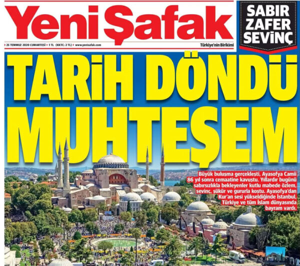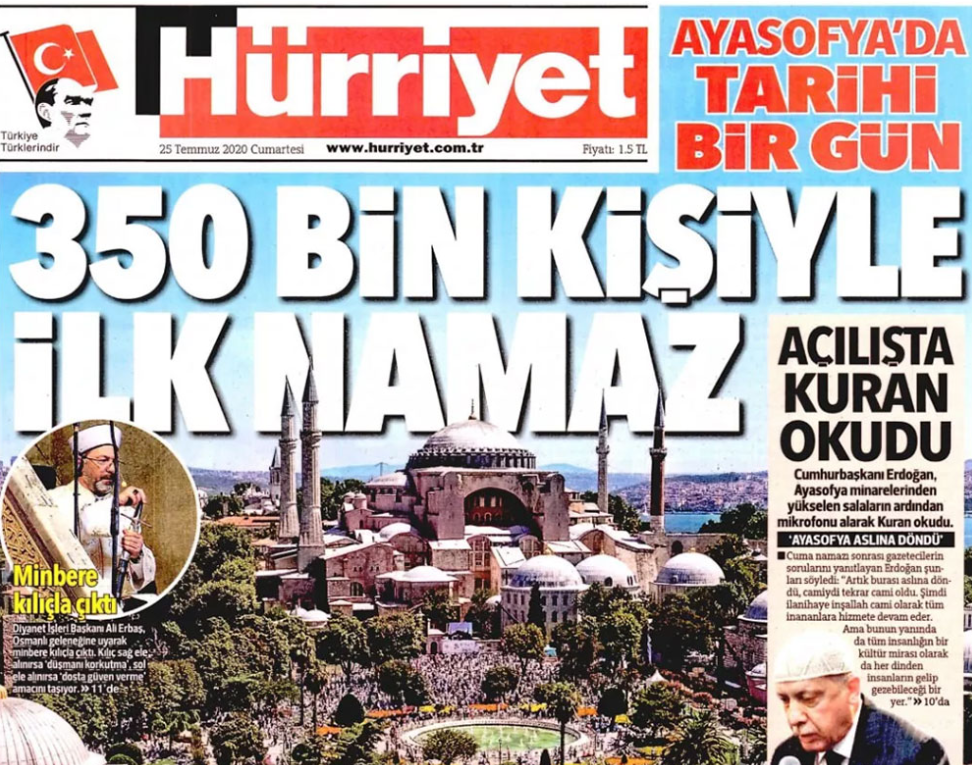 Με προκλητικούς τίτλους κυκλοφορούν σήμερα οι τουρκικές εφημερίδες οι οποίες πανηγυρίζουν για το χθεσινό σόου του Ερντογάν με τη τέλεση της πρώτης μουσουλμανικής προσευχής ύστερα από τη μετατροπή του ιστορικού ναού σε τζαμί. Η HURRIYET κάνει λόγο για “ιστορική ημέρα στην Αγία Σοφία. Πρώτη προσευχή με 350.000 άτομα”.