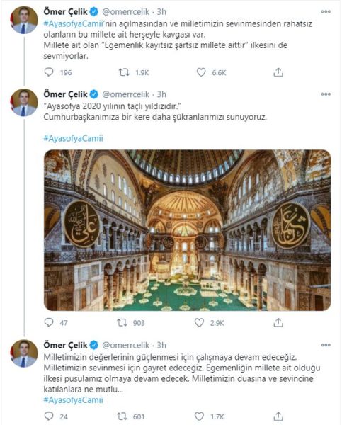 Ο Ομέρ Τσελίκ, εκπρόσωπος του κόμματος του Τούρκου προέδρου Ρετζέπ Ταγίπ Ερντογάν συνέχισε την πρόκληση γύρω από τη μετατροπή της Αγίας Σοφίας σε τζαμί μετά τις δηλώσεις του Τούρκου Προέδρου σε δημοσιογράφους κατά την πρωινή προσευχή που πραγματοποίησε. Ο Τούρκος Πρόεδρος σημείωσε μεταξύ άλλων ότι η μετατροπή της Αγιά-Σοφιάς αποτελεί το στέμμα του 2020 για να έρθει πριν λίγη ώρα ο κ. Τσελίκ να υποστηρίξει αυτήν την άποψη εκφράζοντας την ευγνομωσύνη του στον Τούρκο Πρόεδρο.