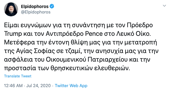 «Είμαι ευγνώμων για τη συνάντηση με τον Πρόεδρο Τραμπ και τον Αντιπρόεδρο Πενς στο Λευκό Οίκο. Μετέφερα την έντονη θλίψη μας για την μετατροπή της Αγίας Σοφίας σε τζαμί, την ανησυχία μας για την ασφάλεια του Οικουμενικού Πατριαρχείου και την προστασία των θρησκευτικών ελευθεριών», ανέφερε ο Αρχιεπίσκοπος Ελπιδοφόρος σε ανάρτησή του στο twitter.