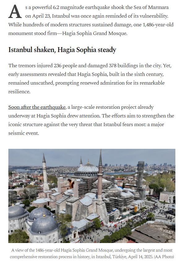 Την ώρα που εκατοντάδες σύγχρονα κτίρια στην Κωνσταντινούπολη υπέστησαν ζημιές και σχεδόν ενάμιση εκατομμύριο κρίθηκαν επικίνδυνα μετά τον ισχυρό σεισμό των 6,2 Ρίχτερ στις 23 Απριλίου, το ιερό σύμβολο της Ορθοδοξίας και Μνημείο Παγκόσμιας Πολιτιστικής Κληρονομιάς, η Αγία Σοφία βγήκε αλώβητη, όπως αναφέρει ο τουρκικός Τύπος. Αντίθετα, τον κώδωνα του κινδύνου κρούει ο Ευθύμης Λέκκας σε περίπτωση μεγαλύτερου σεισμού.