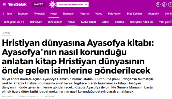 Ένα βιβλίο για την Αγία Σοφία θα σταλθεί με εντολή του Τούρκου Προέδρου Ρετζέπ Ταγίπ Ερντογάν στα “κορυφαία ονόματα του χριστιανικού κόσμου” όπως αναφέρεται σε σημερινό, 3 Σεπτεμβρίου 2020, δημοσίευμα της τουρκικής Yenisafak με το πώς θα πρέπει να προστατευτεί η Αγία Σοφία.