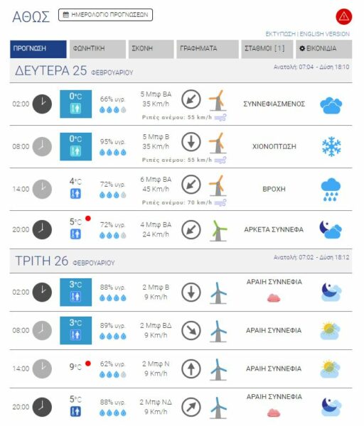 Τετάρτη και Πέμπτη, ο Άθωνας φαίνεται ότι θα σταθεροποιηθεί μεταξύ 5 και 9 βαθμών Κελσίου, με ασθενείς βροχές, αραιή συννεφιά και αρκετές ερχόμενες σταλαγματιές ήλιου.