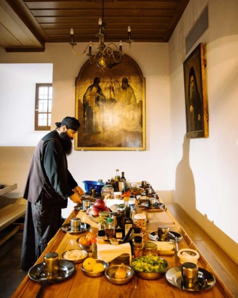 Στην ιστορική μονή όπου οι οι πατέρες μαγειρεύουν με δικά τους προϊόντα για τους εν Χριστώ αδελφούς τους και τους προσκυνητές, στις κατσαρόλες, τα τηγάνια και τα μεγάλα ταψιά αχνίζουν γαριδόσουπα με κριθαράκι, σπανάκι με σουπιές, πράσα κοκκινιστά με χταπόδι και πατάτες Hasselback.