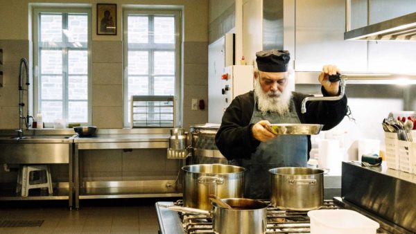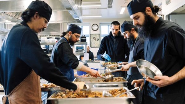 Για τον λόγο αυτόν, το 2021 εγκαινίασαν τις νέες εγκαταστάσεις της κουζίνας τους, που χρειάστηκαν δύο χρόνια για να ολοκληρωθούν. Απλώνονται σε τρεις ορόφους και περιλαμβάνουν ειδικούς χώρους αποθήκευσης και προετοιμασίας υλικών, όπως κόψιμο κρεμμυδιών. «Το μαγειρείο μας σχεδιάστηκε με τέτοιο τρόπο ώστε να μαγειρεύονται μεγάλες ποσότητες σε σύντομο χρονικό διάστημα για να μη χάνουμε χρόνο από τις ακολουθίες», εξηγεί ο πατέρας Φιλωνίδης, με καταγωγή από την Κύπρο, o οποίος παρέλαβε τις συνταγές από τον πατέρα Ιωσήφ, που κρατάει την υψηλή εποπτεία της κουζίνας.