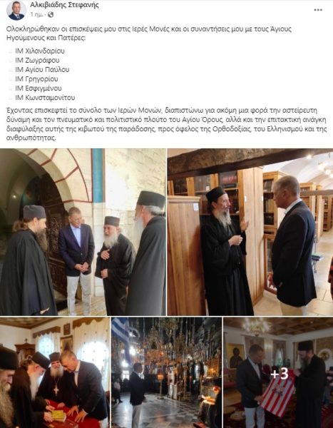 Με μήνυμα του σε μέσο κοινωνικής δικτύωσης, ο Αλκιβιάδης Στεφανής αναφέρει χαρακτηριστικά ότι έχοντας επισκεφτεί το σύνολο των Ιερών Μονών, διαπιστώνει «για ακόμη μια φορά την αστείρευτη δύναμη και τον πνευματικό και πολιτιστικό πλούτο του Αγίου Όρους, αλλά και την επιτακτική ανάγκη διαφύλαξης αυτής της κιβωτού της παράδοσης, προς όφελος της Ορθοδοξίας, του Ελληνισμού και της ανθρωπότητας».