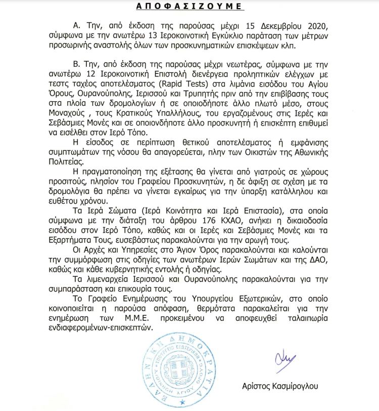 Με απόφαση του Αναπληρωτή Διοικητή του Αγίου Όρους παρατείνεται μέχρι 15 Δεκεμβρίου 2020 η αναστολή όλων των προσκυνηματικών επισκέψεων και επιβάλλεται η διενέργεια προληπτικών ελέγχων στα λιμάνια εισόδου του Αγίου Όρους σε οποιονδήποτε επιθυμεί να εισέλθει στην Αθωνική Πολιτεία, όπως αναφέρεται σε σχετική ανακοίνωση που εξέδωσε το υπουργείο Εξωτερικών.