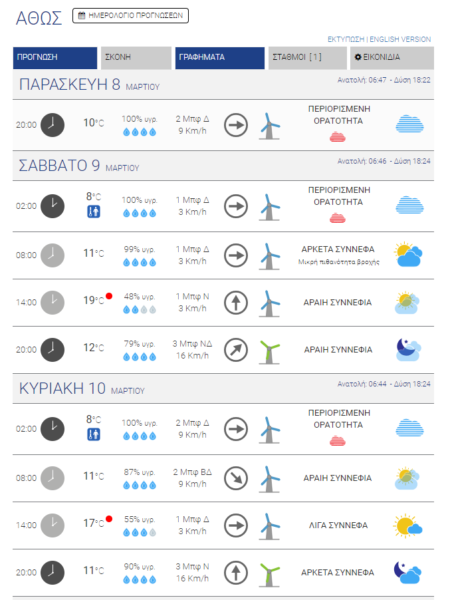 Συννεφιά, αλλά και πλούσιες αχτίδες ήλιου, προβλέπουν οι παρατιθέμενες μετεωρολογικές προβλέψεις του επομένου τριημέρου για τη χερσόνησο του Άθωνα, εκ μέρους του εξειδικευμένου μετεωρολογικού ιστοτόπου meteo.gr. Η θερμοκρασία καθόλον το επόμενο τριήμερο θα κινηθεί θετικά έως και τους 18 βαθμούς Κελσίου, κυρίως κατά τις μεσημεριανές ώρες των επομένων ημερών.