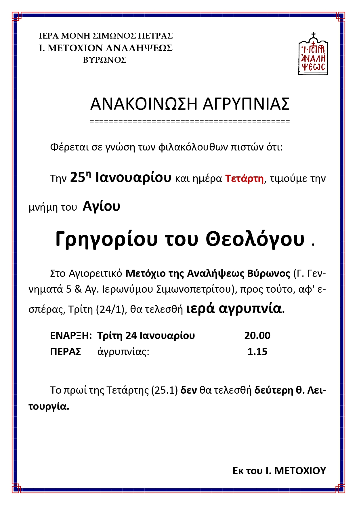 Στο Αγιορειτικό Μετόχιο της Αναλήψεως Βύρωνος (Γ. Γεννηματά 5 & Αγ. Ιερωνύμου Σιμωνοπετρίτου), το απόγευμα της Τρίτης 24 Ιανουαρίου 2023, θα τελεσθή ιερά αγρυπνία.