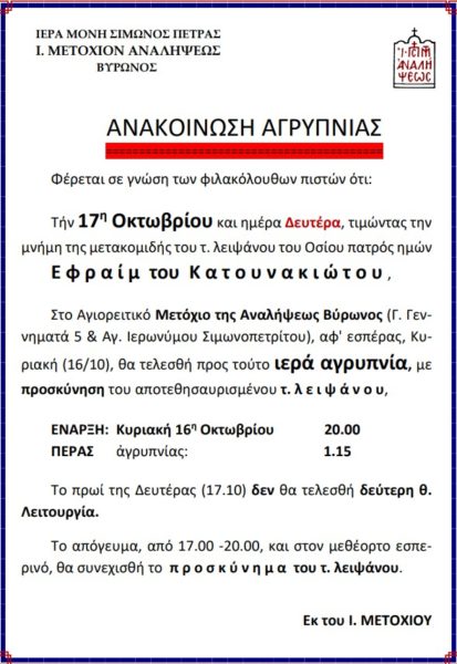 Με αφορμή την εορτή της μετακομιδής του Τιμίου Λειψάνου του Οσίου πατρός Εφραίμ Κατουνακιώτη, στο αγιορειτικό Μετόχιο της Αναλήψεως Βύρωνος, θα τελεσθή ιερά αγρυπνία με προσκύνηση του αποτεθησαυρισμένου Τιμίου Λειψάνου.