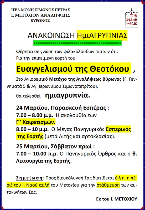 Για την επικείμενη εορτή του Ευαγγελισμού της Θεοτόκου, στο Αγιορειτικό Μετόχιο της Αναλήψεως Βύρωνος θα τελεσθεί ημιαγρυπνία.