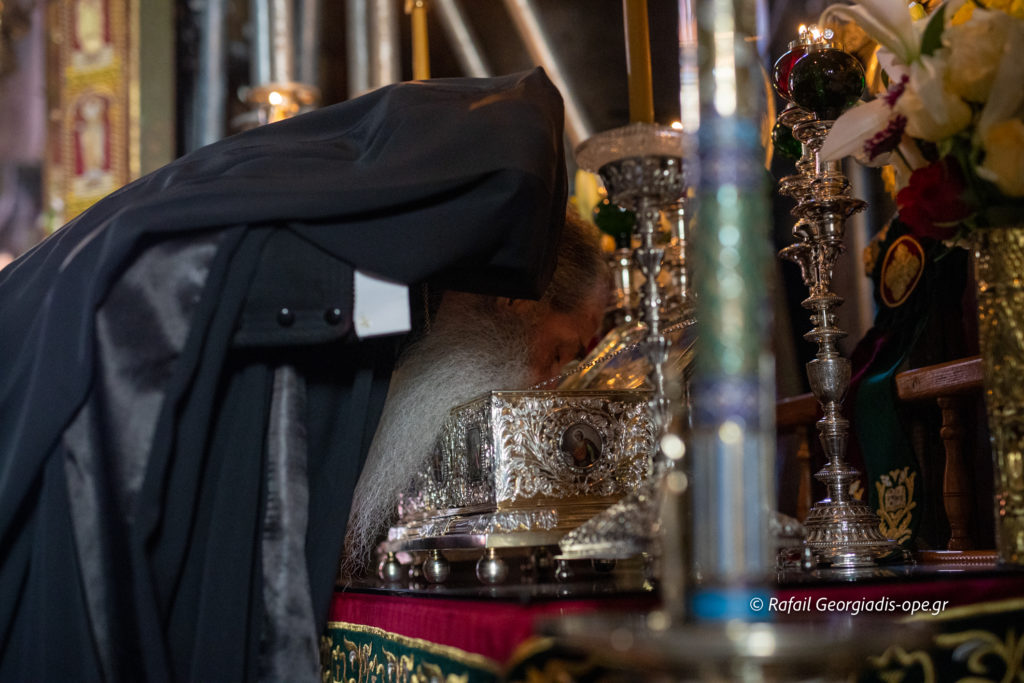 Την παραμονή της εορτής προ του μικρού Εσπερινού η Αγία Ζώνη εξήλθε από το Ιερό Βήμα για την πανηγυρική Αγρυπνία από τον Σεβασμιώτατο Μητροπολίτη Πειραιώς κ. Σεραφείμ, παρουσία του Καθηγουμένου της Μονής Βατοπαιδίου Γέροντος Εφραίμ, ιερέων, ιερομονάχων και διακόνων.