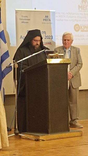 Τον Καθηγούμενο της Ιεράς Μεγίστης Μονής Βατοπαιδίου Γέροντα Εφραίμ εκπροσώπησε ο Ιερομόναχος π. Γεννάδιος Βατοπαιδινός, ο οποίος απηύθυνε χαιρετισμό και απένειμε τα βραβεία.