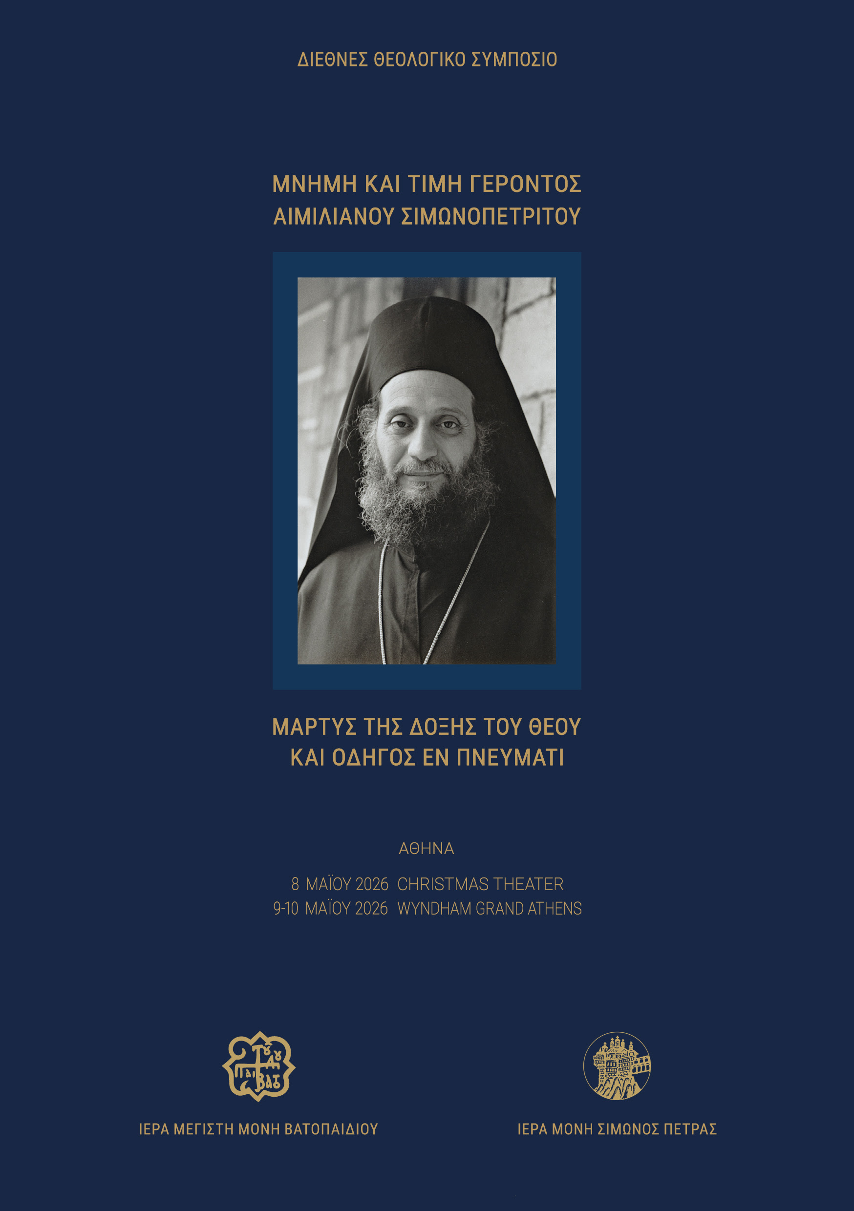 Η Ιερά Μεγίστη Μονή Βατοπαιδίου και η Ιερά Μονή Σίμωνος Πέτρας, διοργανώνουν Διεθνές Θεολογικό Συμπόσιο με θέμα «ΜΝΗΜΗ ΚΑΙ ΤΙΜΗ ΓΕΡΟΝΤΟΣ ΑΙΜΙΛΙΑΝΟΥ ΣΙΜΩΝΟΠΕΤΡΙΤΟΥ: Mάρτυς της δόξης του Θεού και οδηγός εν Πνεύματι».