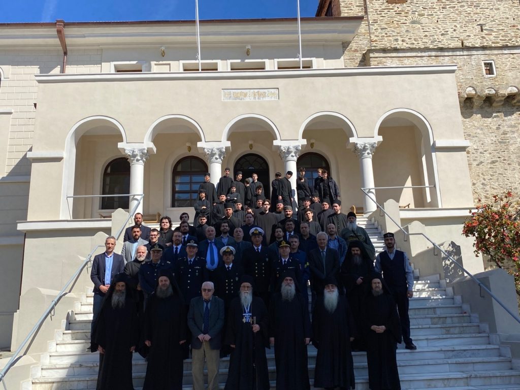 Ακολούθησε η καθιερωμένη δεξίωση στην αίθουσα του Ιεροκοινοτικού Μεγάρου, όπου ο Πρωτεπιστάτης Γέροντας Χριστοφόρος Ιβηρίτης αναφέρθηκε στην σημασία της Επανάστασης για την μαθητιώσα νεολαία.