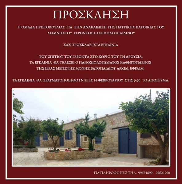 Μετά το πέρας της ανακαίνισης της πατρικής οικίας του Γέροντος Ιωσήφ του Βατοπαιδινού στο χωριό Δρούσεια της επαρχίας Πάφου, την Τετάρτη 14 Φεβρουαρίου και ώρα 3:30μ.μ. θα τελεσθούν τα εγκαίνια υπό του Πανοσιολογιωτάτου Καθηγουμένου της Ιεράς Μεγίστης Μονής Βατοπαιδίου Αρχιμανδρίτη Εφραίμ.