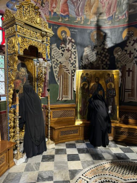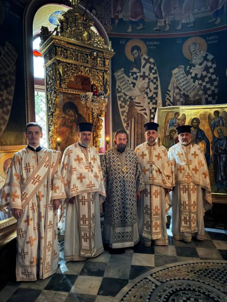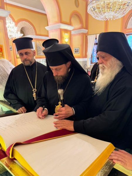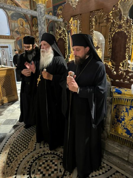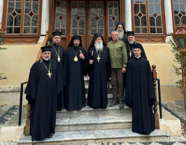 Κατά τη διάρκεια της πρόσφατης επίσκεψής του στον Άθωνα, μαζί με όμιλο κληρικών και λαϊκών, ο Ηγούμενος της Λαύρας του Κιέβου, Θεοφιλέστατος Επίσκοπος Μπορίσπιλ κ. Αβραάμιος προσευχήθηκε μπροστά στις εικόνες, στο Καθολικό της Μονής Ξενοφώντος, μαζί με τον Ηγούμενο της Μονής Γέροντα Αλέξιο.