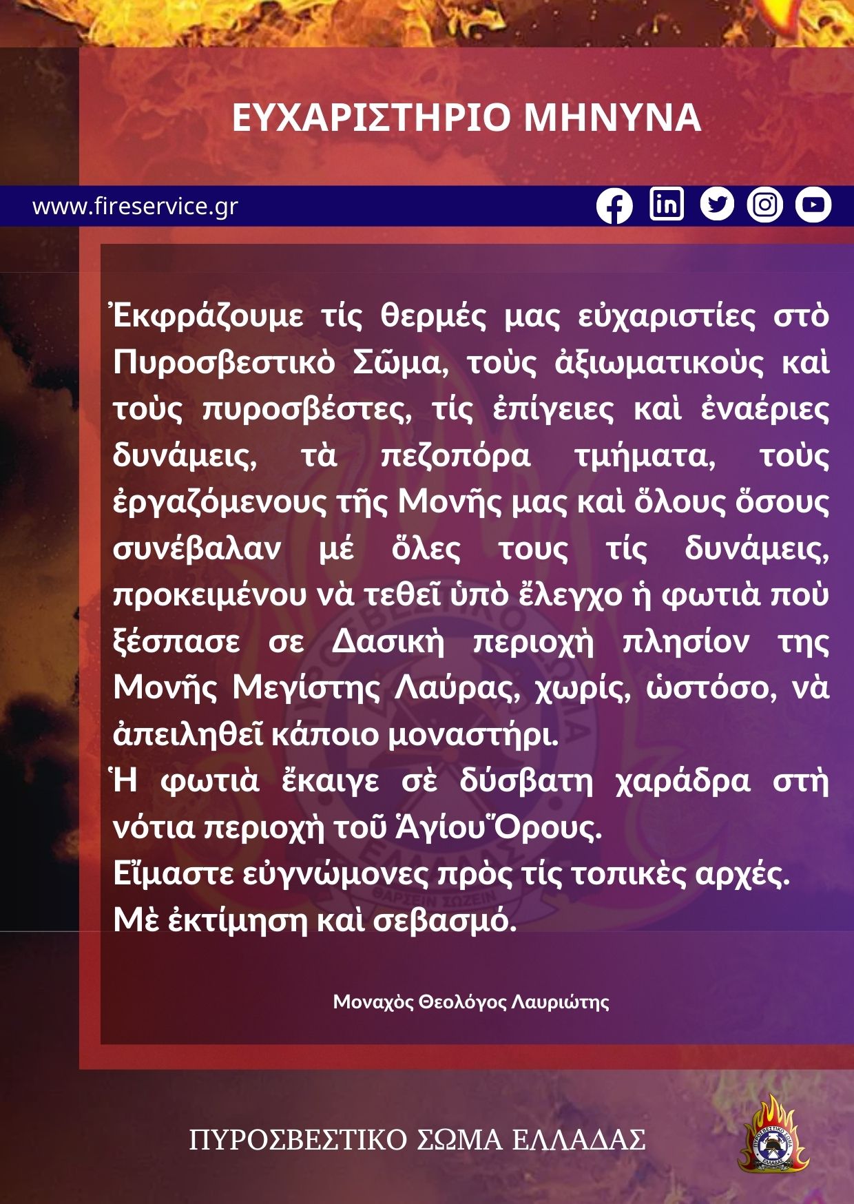 Ἐκφράζουμε τίς θερμές μας εὐχαριστίες στὸ Πυροσβεστικὸ Σῶμα, τοὺς ἀξιωματικοὺς καὶ τοὺς πυροσβέστες, τίς ἐπίγειες καὶ ἐναέριες δυνάμεις, τὰ πεζοπόρα τμήματα, τοὺς ἐργαζόμενους τῆς Μονῆς μας καὶ ὅλους ὅσους συνέβαλαν μέ ὅλες τους τίς δυνάμεις, προκειμένου νὰ τεθεῖ ὑπὸ ἔλεγχο ἡ φωτιὰ ποὺ ξέσπασε σὲ Δασικὴ περιοχὴ πλησίον της Μονῆς Μεγίστης Λαύρας σήμερα τὸ πρωὶ στὶς 7:00