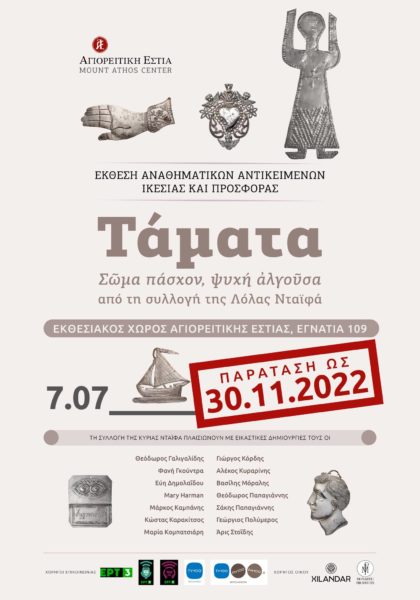 Στην Αγιορειτική Εστία η συλλογή ταμάτων της Λόλας Νταϊφά παρουσιάζεται για πρώτη φορά στο κοινό. Από ασήμι, χρυσό, χαλκό ή ταπεινή λαμαρίνα, τα τάματα ξετυλίγουν ανθρώπινες ιστορίες και αποκτούν περαιτέρω νοήματα στο μεταίχμιο του απτού με τον άυλο κόσμο. Μικρά αντικείμενα, φωτογραφίες και κείμενα τεκμηρίωσης αναδεικνύουν την κοινωνική και θρησκευτική διάσταση της αφιερωτικής πρακτικής, ενώ έργα σύγχρονων εικαστικών φανερώνουν την επιρροή των αναθημάτων στην τέχνη. Η διαχρονικότητα των ταμάτων δείχνει τη διαρκή ανάγκη των ανθρώπων για ελπίδα, η οποία ξεπερνά την ανθρώπινη υπόσταση.