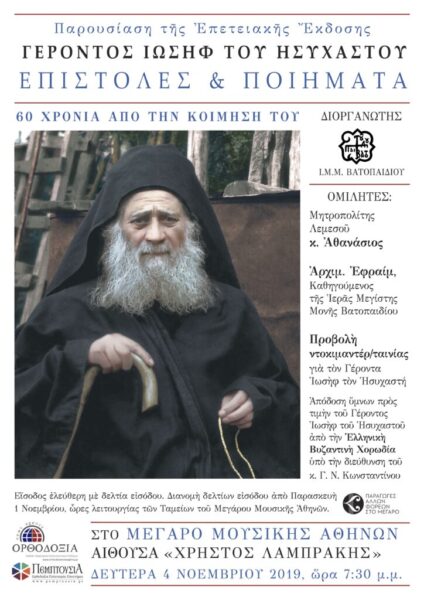 Με την ευκαιρία της επετειακής εκδόσεως της Ιεράς Μεγίστης Μονής Βατοπαιδίου, Γέροντος Ιωσήφ του Ησυχαστού, «Επιστολές και Ποιήματα (60 χρόνια από την κοίμηση του)»,η Μονή Βατοπαιδίου διοργανώνει για την παρουσίαση της νέας αυτής εκδόσεως εκδήλωση, η οποία θα πραγματοποιηθεί την Δευτέρα 4 Νοεμβρίου 2019 και ώρα 7:30 μ.μ. στην αίθουσα «Χρήστος Λαμπράκης» του Μεγάρου Μουσικής Αθηνών.