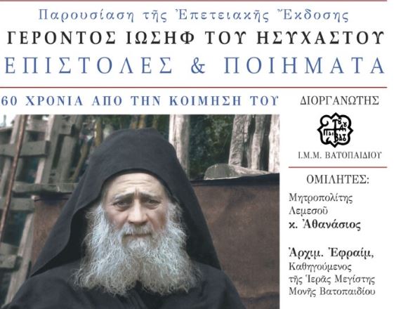 Με την ευκαιρία της επετειακής εκδόσεως της Ιεράς Μεγίστης Μονής Βατοπαιδίου, Γέροντος Ιωσήφ του Ησυχαστού, «Επιστολές και Ποιήματα (60 χρόνια από την κοίμηση του)»,η Μονή Βατοπαιδίου διοργανώνει για την παρουσίαση της νέας αυτής εκδόσεως εκδήλωση, η οποία θα πραγματοποιηθεί την Δευτέρα 4 Νοεμβρίου 2019 και ώρα 7:30 μ.μ. στην αίθουσα «Χρήστος Λαμπράκης» του Μεγάρου Μουσικής Αθηνών.
