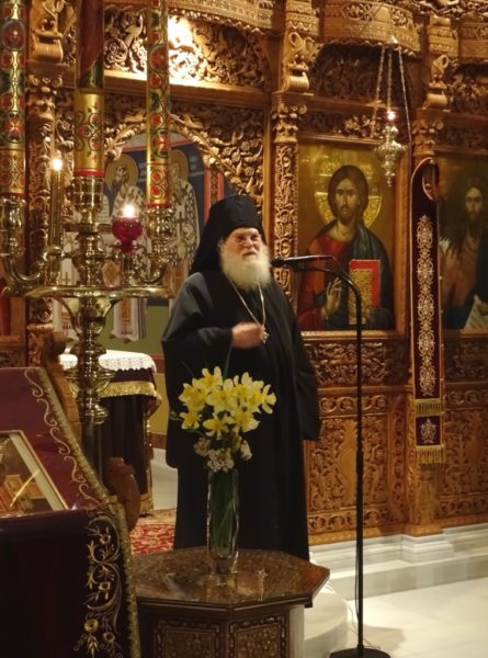 Ο Γέροντας στον λόγο του απευθυνόμενος προς την Αδελφότητα και τους προσκυνητές αναφέρθηκε στο πρόσωπο της Κυρίας Θεοτόκου και στον σύνδεσμο των πιστών με την Παναγία, ως μεσίτρια προς τον Κύριο. Η Παναγία, σημείωσε ο Γέροντας, με όσα έζησε, με κορυφαίο γεγονός την Σταυρική θυσία του Κυρίου μας, καθώς ανθρωπίνως πόνεσε βλέποντας τον Υιό της επί του Σταυρού, καθίσταται πρότυπο υπομονής στον πόνο και την δοκιμασία για κάθε πιστό Χριστιανό.