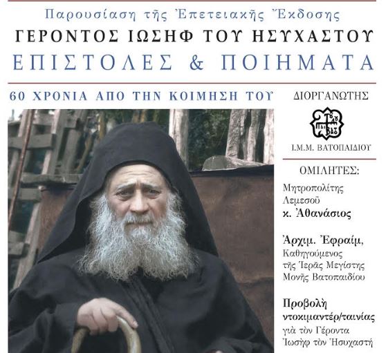 Με την ευκαιρία της επετειακής εκδόσεως της Ιεράς Μεγίστης Μονής Βατοπαιδίου, Γέροντος Ιωσήφ του Ησυχαστού, «Επιστολές και Ποιήματα (60 χρόνια από την κοίμηση του)», η Μονή Βατοπαιδίου διοργανώνει για την παρουσίαση της νέας αυτής εκδόσεως εκδήλωση, η οποία θα πραγματοποιηθεί την Δευτέρα 4 Νοεμβρίου 2019 και ώρα 7:30 μ.μ. στην αίθουσα «Χρήστος Λαμπράκης» του Μεγάρου Μουσικής Αθηνών.