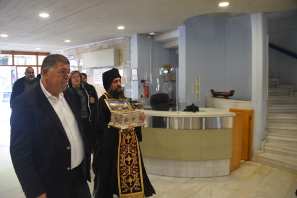 Σε κλίμα κατάνυξης ο Δήμαρχος Θεόδωρος Πυρίλλης, μέλη του Δημοτικού Συμβουλίου και το προσωπικό προσκύνησαν με ευλάβεια το Θεομητορικό κειμήλιο, το οποίο κόμισαν Βατοπαιδινοί Πατέρες.