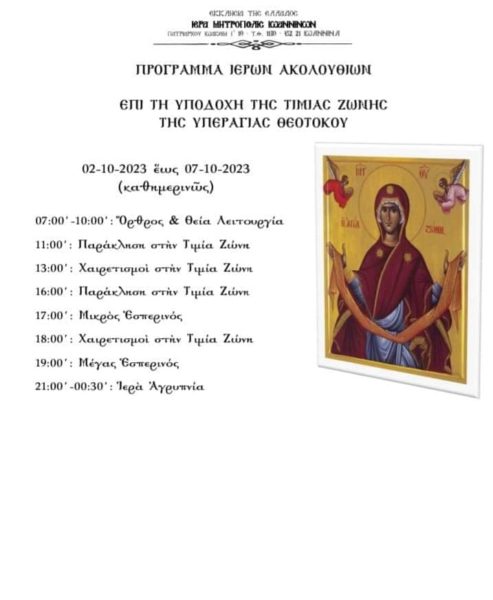 Η επίσημη υποδοχή της Αγίας Ζώνης στα Ιωάννινα θα πραγματοποιηθεί στις 5 το απόγευμα, στον αύλειο χώρο του Ιερού Ναού Αγίου Παϊσίου στην Κιάφα και θα παραμείνει για προσκύνημα στον Ιερό Ναό έως το Σάββατο 7 Οκτωβρίου 2023.