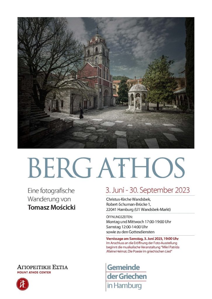 Μετά από πρόσκληση της Ελληνικής Κοινότητας του Αμβούργου και του προέδρου της κ. Παναγιώτη Δροσινάκη, εγκαινιάζεται το Σάββατο 3 Ιουνίου στο Αμβούργο η έκθεση φωτογραφίας με τίτλο Φωτογραφικό οδοιπορικό στο Άγιον Όρος με τη ματιά του πολωνού φωτογράφου Tomasz Mosciski (Τόμας Μοστσίτσκι).
