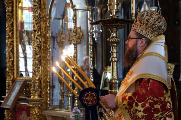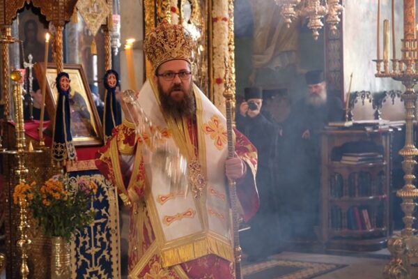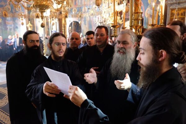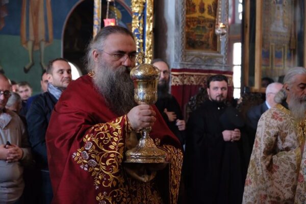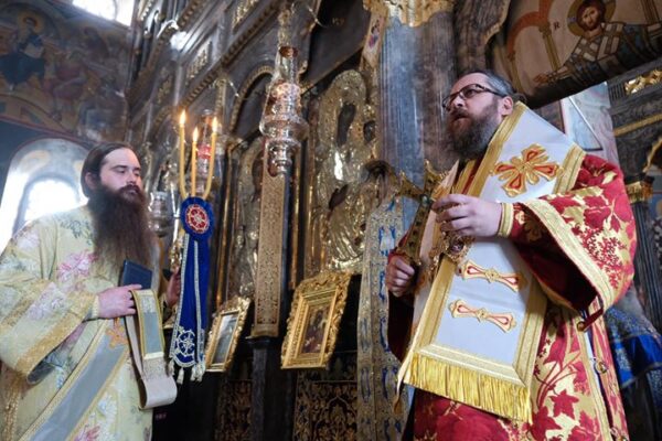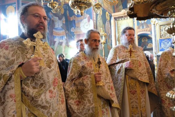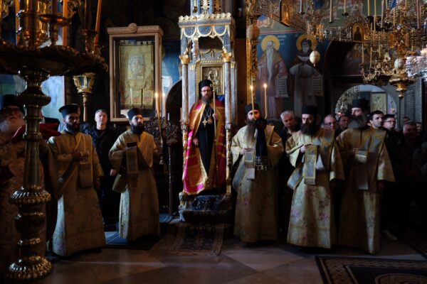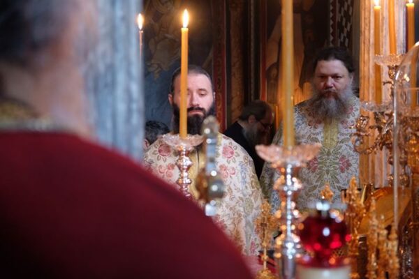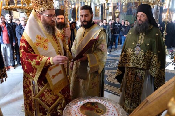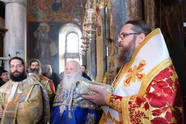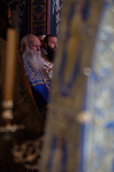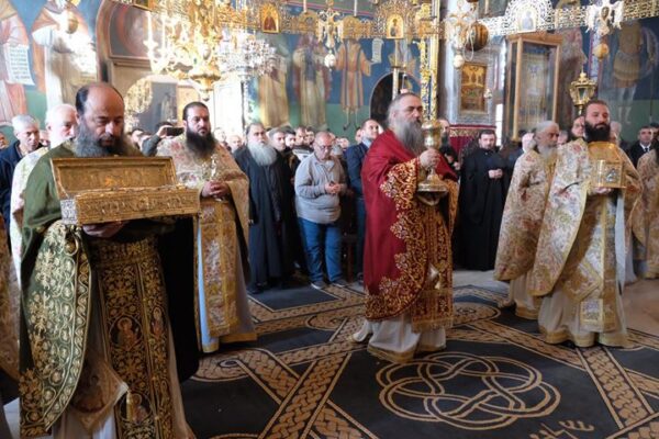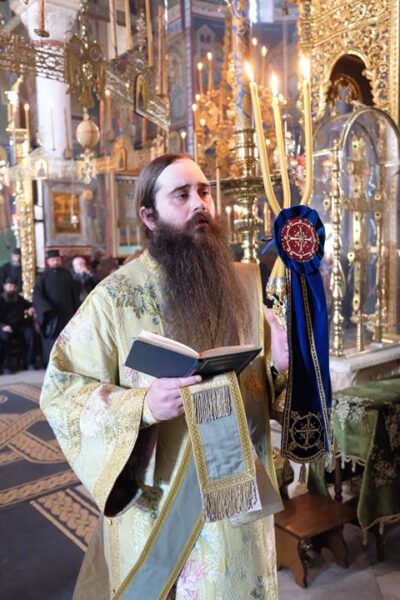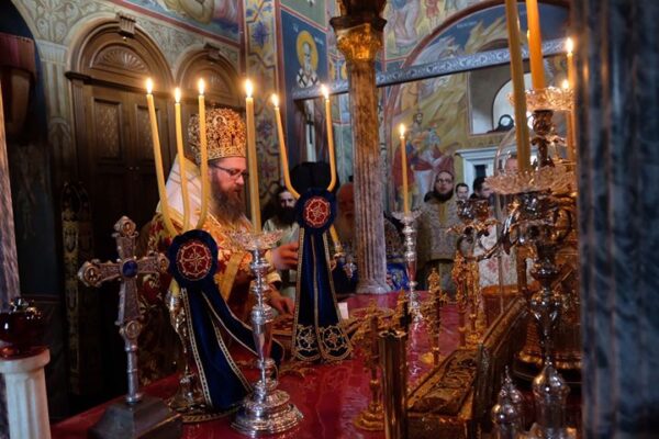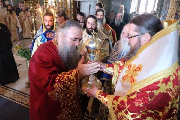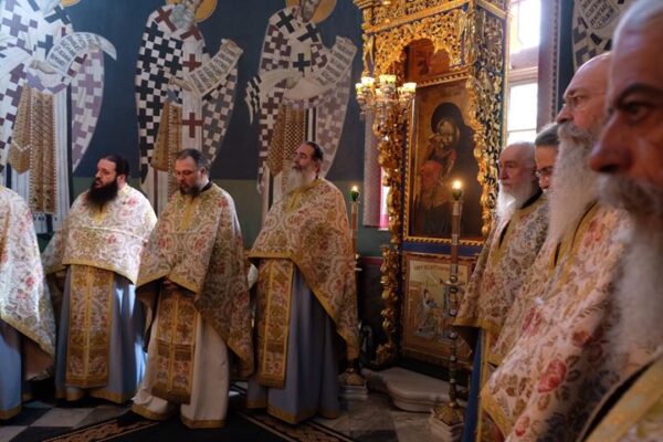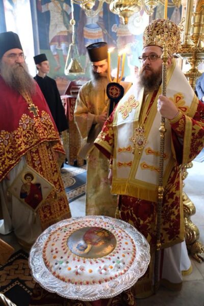 Στην πανηγυρική Θεία Λειτουργία προεξήρχε ο Θεοφιλέστατος Επίσκοπος Λευκουπόλεως κ. Πολύκαρπος εκ του Πατριαρχείου Βουλγαριας, πλαισιούμενος από τον Ηγούμενο της Ιεράς Μονής Εσφιγμένου Αρχιμ. Βαρθολομαίο, τον Ηγούμενο της Ιεράς Μονής Παντοκράτορος Αρχιμ. Γαβριήλ , τον Ηγούμενο της Ιεράς Μονής Ξενοφώντος Αρχιμ. Αλέξιο και πλειάδα Ιερομονάχων και ιεροδιακονων.