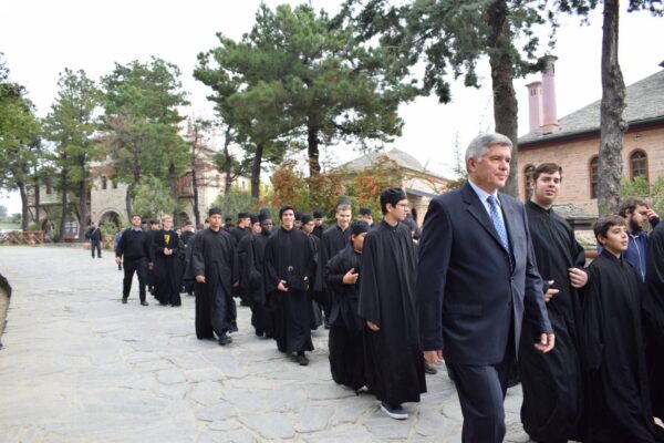 Ακολούθησε το καθιερωμένο κέρασμα στην αίθουσα συνεδριών της Ιεράς Κοινότητος, όπου στο τέλος εψάλη ο εθνικός ύμνος από όλους τους μαθητές της Αθωνιάδος, η οποία εφέτος αριθμεί περί τους 90.