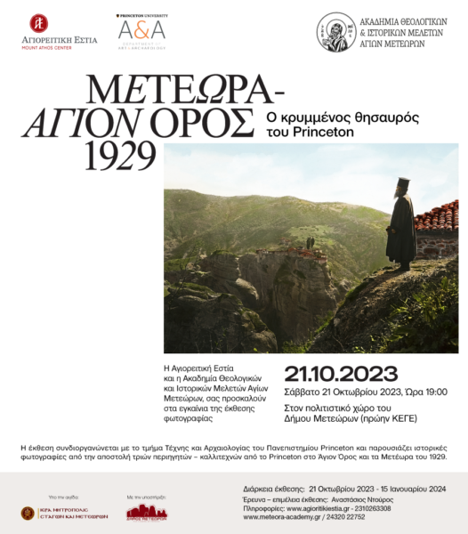 Η Αγιορειτική Εστία σε συνεργασία με το τμήμα Τέχνης και Αρχαιολογίας του Πανεπιστημίου Princeton και την Ακαδημία Θεολογικών και Ιστορικών Μελετών Αγίων Μετεώρων, παρουσιάζουν στην Καλαμπάκα την έκθεση με ιστορικές φωτογραφίες από την αποστολή τριών περιηγητών – καλλιτεχνών από το Princeton στα Μετέωρα και το Άγιον Όρος του 1929.