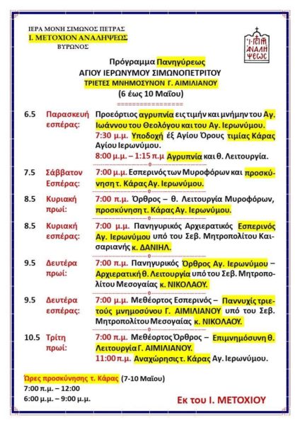 Τη μνήμη του Αγίου Ιερωνύμου του Σιμωνοπετρίτου πανηγυρίζει στις 9 Μαΐου το Ι. Αγιορειτικό Μετόχι Αναλήψεως Βύρωνος Αττικής. Για την πανήγυρη, θα προσκομισθεί από το Άγιο Όρος προς προσκύνηση και ευλογία των πιστών η τιμία κάρα του, η οποία θα θησαυριστεί στον Ναό από την 6η έως την 10η Μαΐου.
