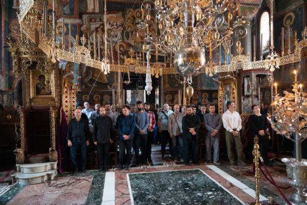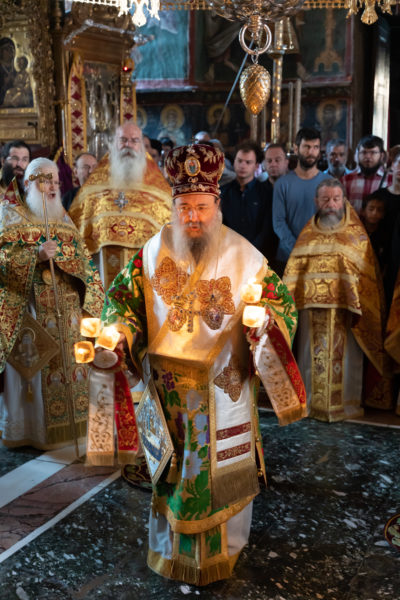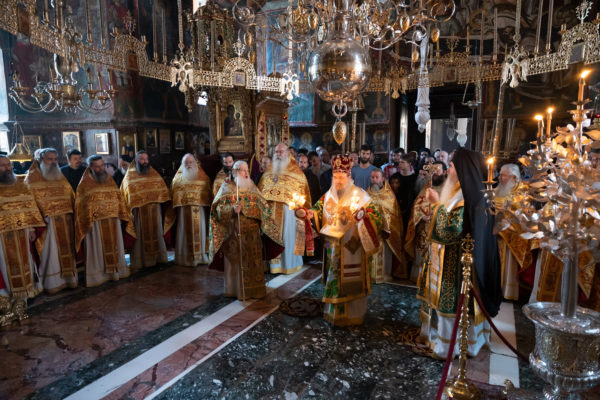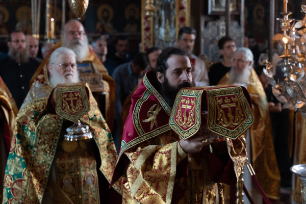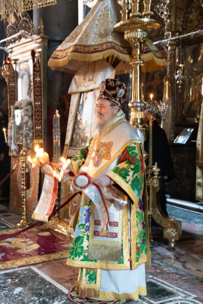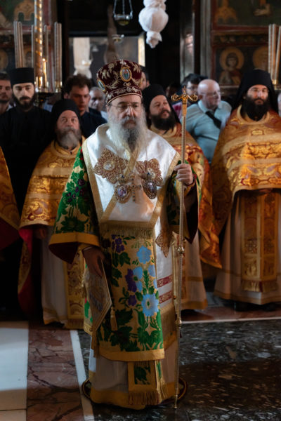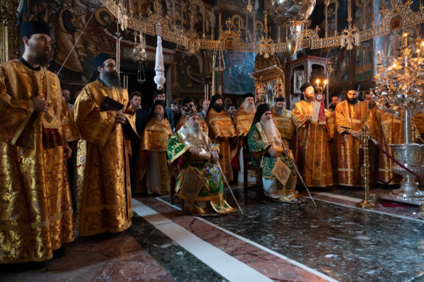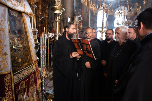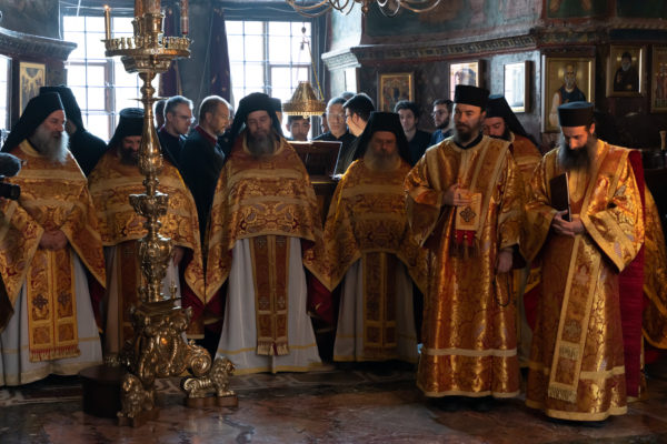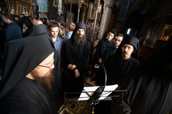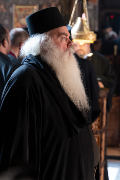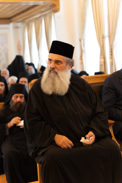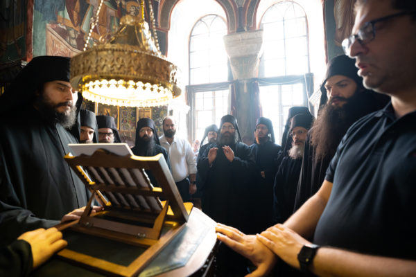 Τα αναλόγια πλαισίωσαν ο κ. Γεώργιος Χατζηχρόνογλου, Άρχων Υμνωδός της ΜτΧΕ και Πρωτοψάλτης του Καθεδρικού Ναού Παναγίας Φανερωμένης Χολαργού και Βατοπαιδινοί Πατέρες.