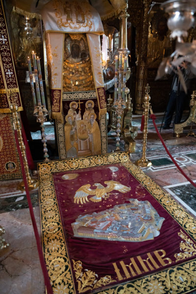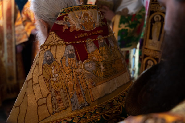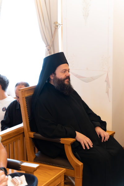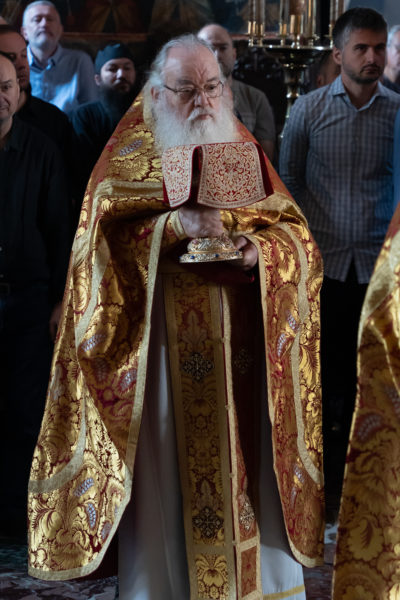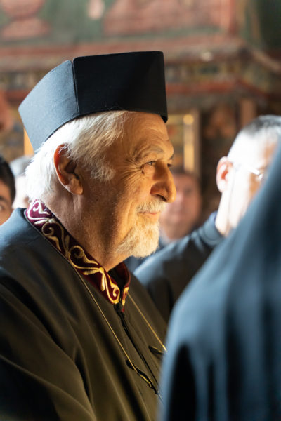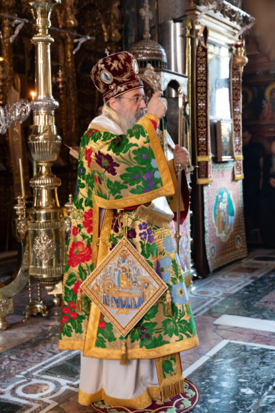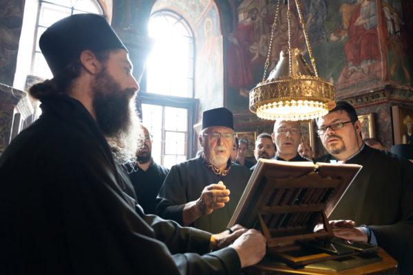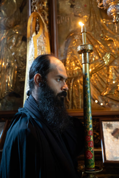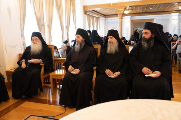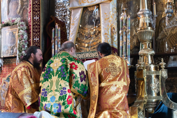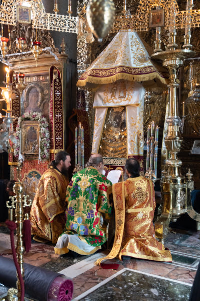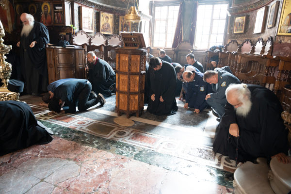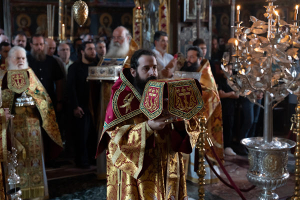 Τα αναλόγια πλαισίωσαν ο κ. Γεώργιος Χατζηχρόνογλου, Άρχων Υμνωδός της ΜτΧΕ και Πρωτοψάλτης του Καθεδρικού Ναού Παναγίας Φανερωμένης Χολαργού και Βατοπαιδινοί Πατέρες.