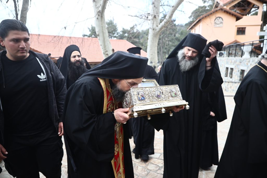 Λίγες ώρες πριν την αναχώρησή της από την Κύπρο, η Αγία Ζώνη της Παναγίας εκομίσθη στην Ιερά Μονή Τιμίου Προδρόμου Μέσα Ποταμού. Την Αγία Ζώνη κόμισε στην Ιερά Μόνη ο Γέροντας Εφραίμ με τη συνοδεία Βατοπαιδινών πατέρων. Ακολούθησε λιτανευτική πομπή προς το Καθολικό της Μονής όπου τελέστηκε δέηση και εν συνεχεία ιερά αγρυπνία την οποία τέλεσε ο Γέροντας Εφραίμ. Η Αγία Ζώνη αναχώρησε σήμερα το πρωί από την Ιερά Μονή με προορισμό το παλαιό αεροδρόμιο της Λάρνακας από όπου θα αναχωρήσει για την επιστροφή της στο Άγιον Όρος.