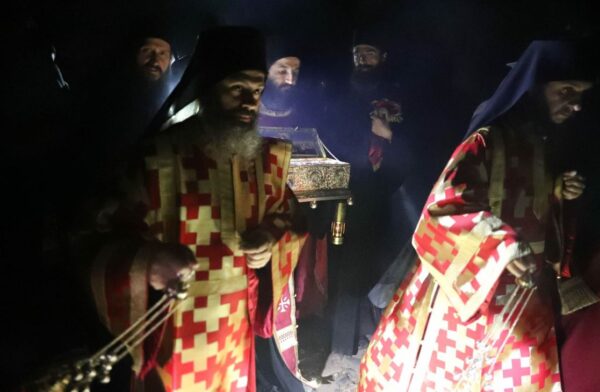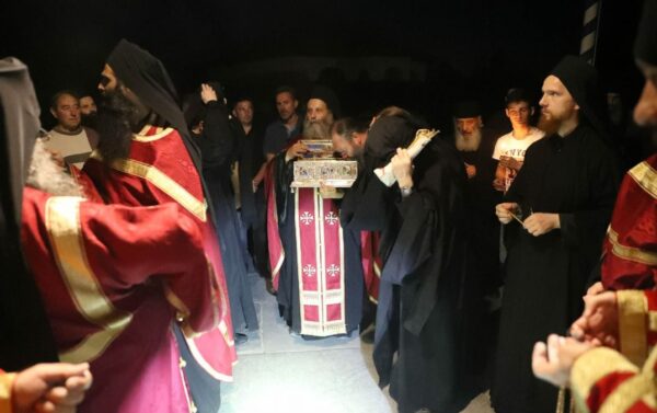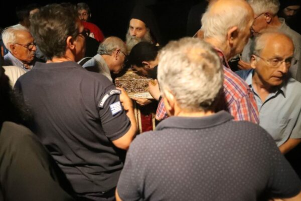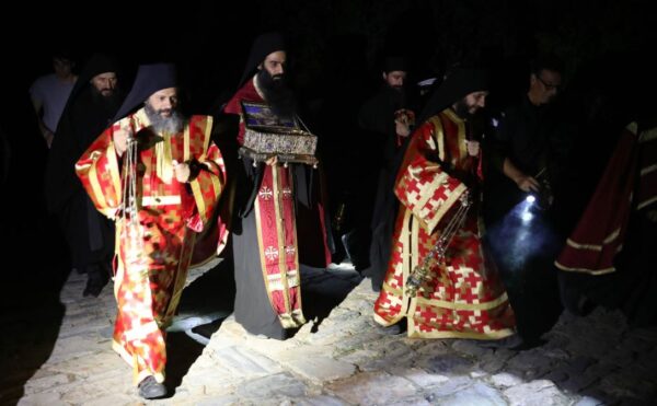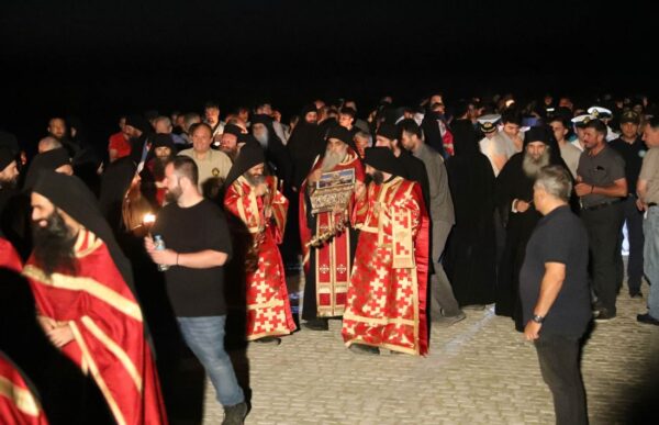 Οι Βατοπαιδινοί πατέρες ανάμεσα σε πλήθος κόσμου συνόδευσαν το Ιερό κειμήλιο μέχρι τον τόπο που φυλάσσεται και οι ψαλμωδίες τους και δοξολογίες τους ένιωθε κανείς ότι έφταναν ως τον Ουρανό.