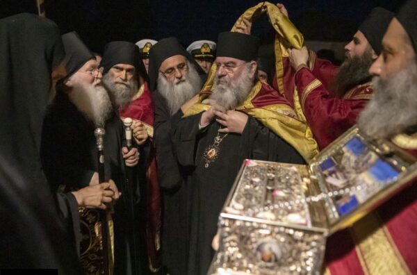 Ο καθηγούμενος της Ιεράς Μεγίστης Μονής Βατοπαιδίου Γέροντάς Εφραίμ μετέφερε στα χέρια του το ιερό κειμήλιο παρουσία του Σεβασμιωτάτου Μητροπολίτου Λεμεσού κ. Αθανασίου.