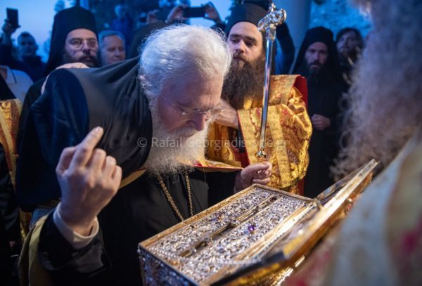 Συγκινημένος προχώρησε μπαίνοντας στην είσοδο της Μονής, ενώ προπορεύονταν οι χοροί των μοναχών ψάλλοντας το Άξιον Εστί σε δεύτερο ήχο, το λεγόμενο «Αγιορείτικο». Η πομπή (ψάλτες, ιερείς, διάκονοι, ο Γέροντας έχοντας φορέσει τον ηγουμενικό μανδύα, οι μοναχοί και λίγοι προσκυνητές) προχώρησε προς το Ναό