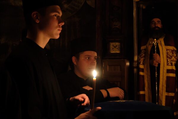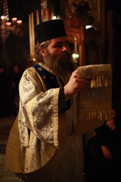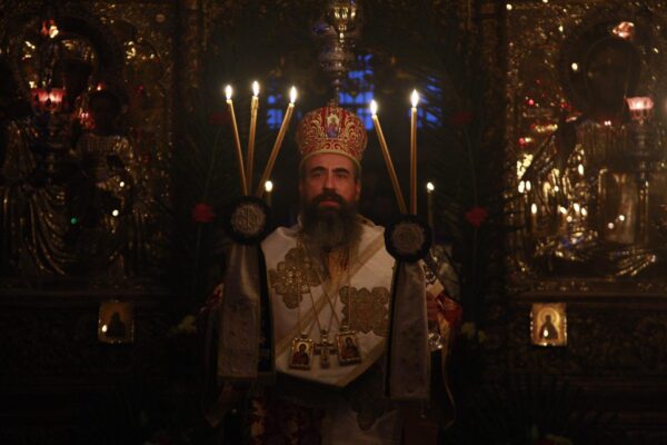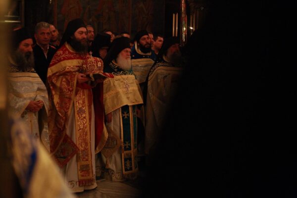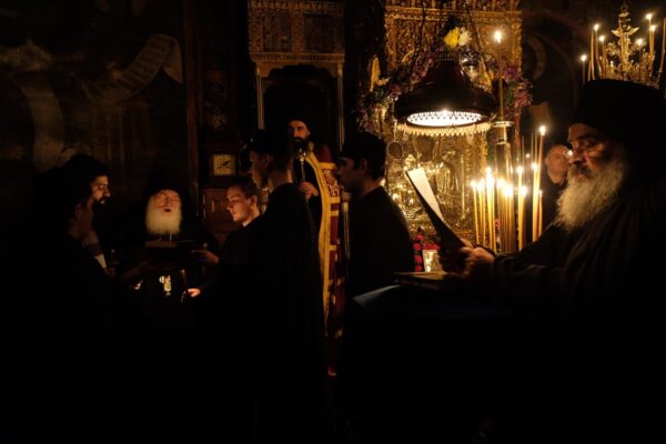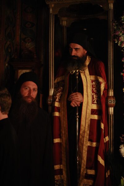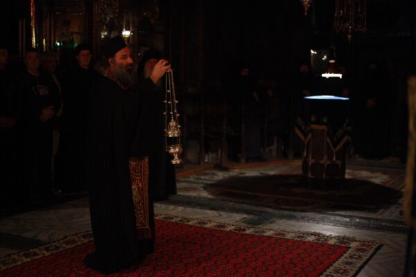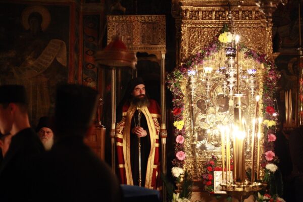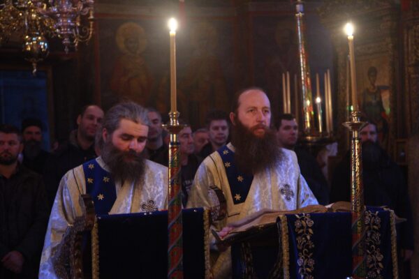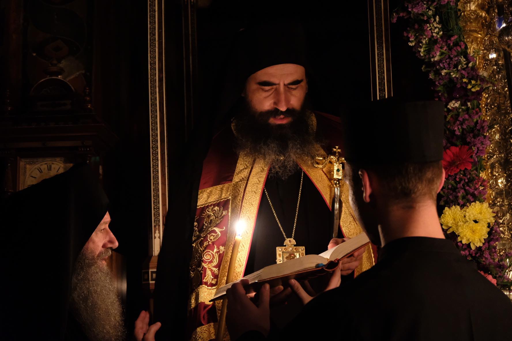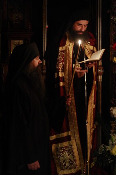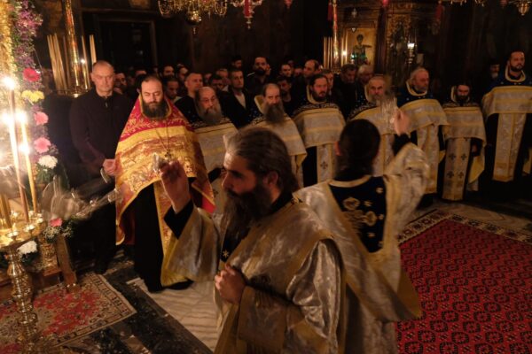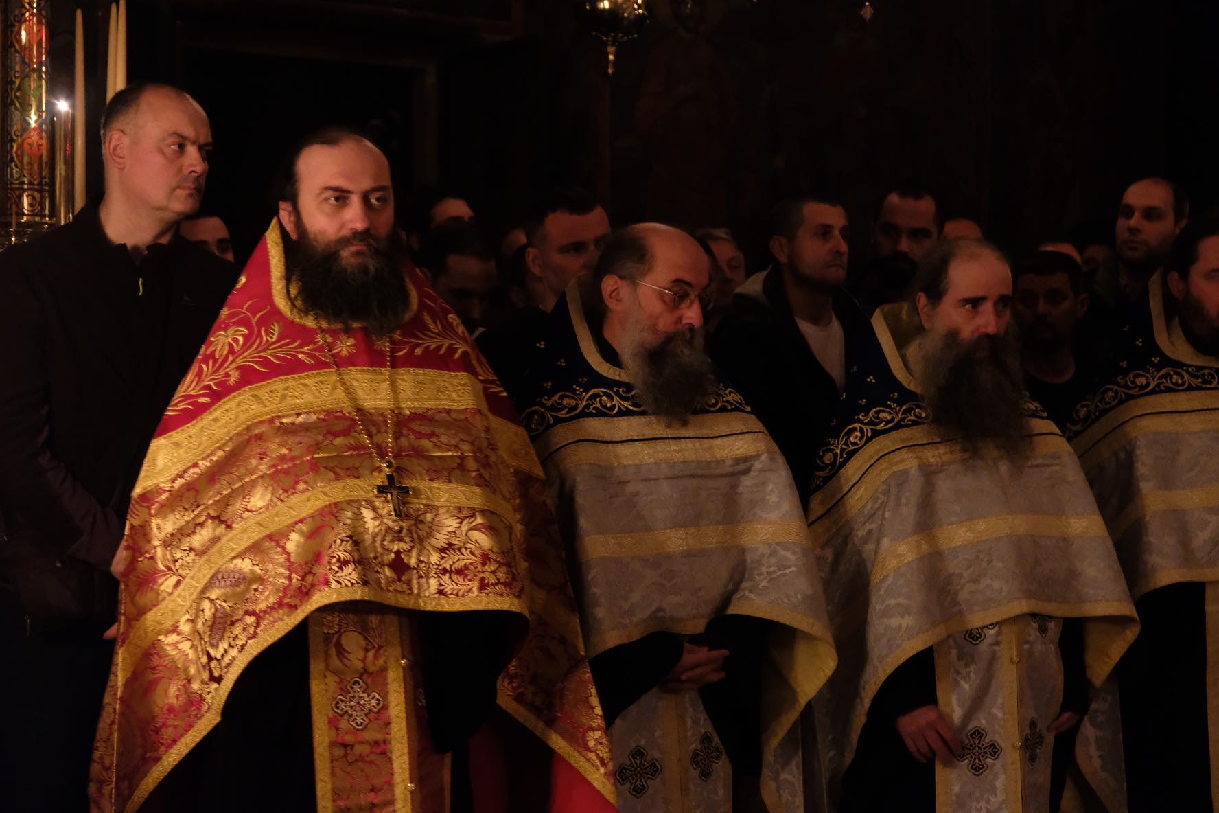 Η αγρυπνία ξεκίνησε με τον Πανηγυρικό Εσπερινό χοροστατούντος του Θεοφιλέστατου Επισκόπου Διοκλείας κ. Μεθοδίου, βοηθού Επισκόπου του Μητροπολίτη Μαυροβουνίου και Παραθαλασσίας κ. Αμφιλοχίου από το Πατριαρχείο της Σερβίας, ο οποίος προεξήρχε της Θ. Λειτουργίας , ενώ συλλειτούργησαν μαζί του ο Καθηγούμενος της Ιεράς Μεγίστης Μονής Βατοπαιδίου Αρχιμανδρίτης Εφραίμ, ο Καθηγούμενος της Ιεράς Μονής Χιλανδαρίου, αγιορείτες ιερομόναχοι εκπρόσωποι των σεβασμίων ιερών μονών.