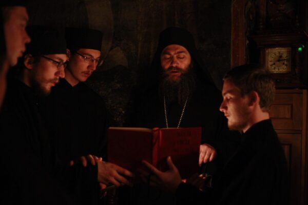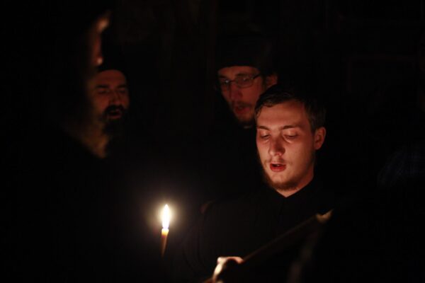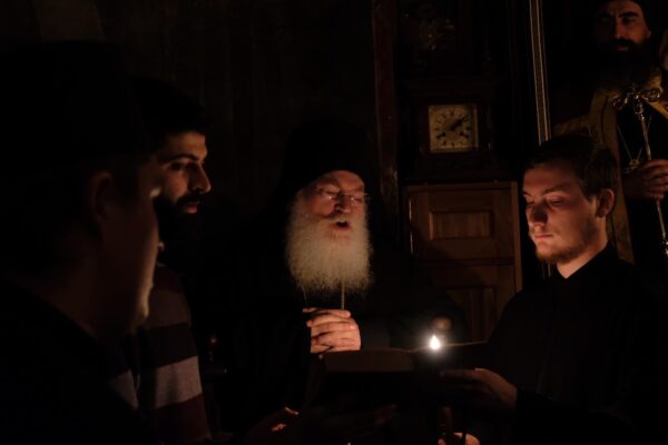 Τα αναλόγια λάμπρυναν με τις καλλικέλαδες φωνές τους , δεξιά ο π. Δαμασκηνός Νεοσκητιώτης από το κελλί των Αγίων Αναργύρων και αριστερά πατέρες από το κελλί του Μπουραζέρι.