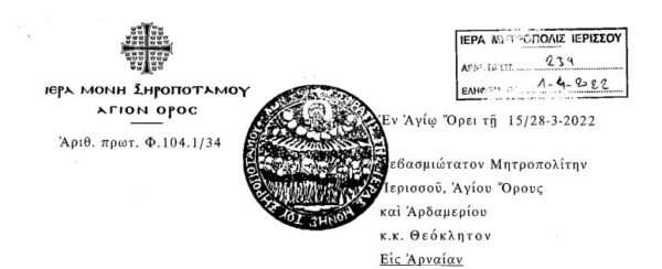 Διά τοῦ παρόντος κοινοποιοῦμεν ὑμῖν τήν ὑπ’ ἀριθμ. Πρωτ. 104.1/34/15/28-3-2022 Ἐπιστολήν-ἀπάντησιν τοῦ Καθηγουμένου τῆς Ἱερᾶς Μονῆς Ξηροποτάμου τοῦ Ἁγίου Ὄρους Παν. Ἀρχιμ. π. Ἰωσήφ, σχετικήν μέ τήν μετακομιδήν τοῦ Τιμίου Σταυροῦ ἐκ τῆς Ἱερᾶς Μονῆς Ξηροποτάμου εἰς τήν Ἐνορίαν σας εἰς προσκύνησιν καί ἁγιασμόν τοῦ φιλοχρίστου Λαοῦ κατά τό Σάββατον τοῦ Λαζάρου καί Κυριακήν τῶν Βαΐων, ὡς ἔθος ἐστι ἀπό πολλῶν ἐτῶν.