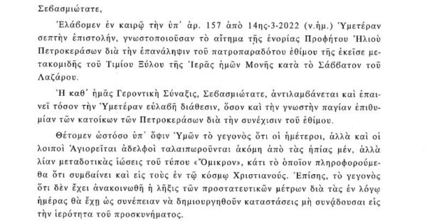 Κατόπιν τῆς ἀδυναμίας τῆς Ἱερᾶς Μονῆς – λόγῳ τῆς πανδημίας τοῦ Κορωναΐοῦ – νά προσκομίσῃ τόν Μέγα τοῦτον θησαυρόν τῆς Ὀρθοδοξίας εἰς τήν καθ’ Ἡμᾶς Ἱεράν Μητρόπολιν κατά τήν περίοδον πρό τοῦ Ἁγίου Πάσχα ὡς κατ’ ἔτος λαμβάνει χώραν, παραγγέλλομεν ὑμῖν ὅτι διά τό φετινόν ἔτος δέν θά προσέλθῃ εἰς Πετροκέρασα τό Τίμιον Ξύλον, ἀλλά σύν Θεῷ πρό τοῦ Ἁγίου Πάσχα τοῦ ἑπομένου ἔτους θά ἔχωμεν τήν τιμήν καί πάλιν νά λάβωμεν τήν εὐλογίαν Του.
