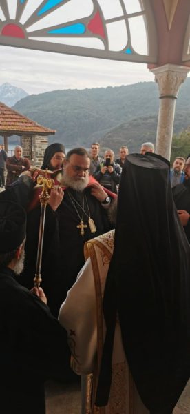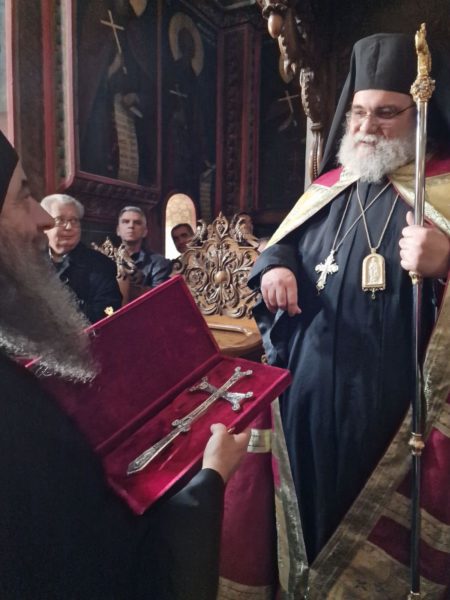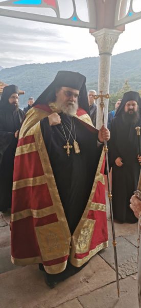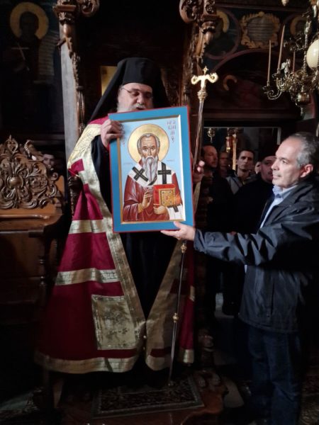 Στο Καθολικό της Ιεράς Μονής με τις εφέστιες Ιερές Εικόνες της Μεταμορφώσεως του Σωτήρος Χριστού και της Παναγίας Γερόντισσας να διακρίνονται, ο Γέροντας Γαβριηλ, προσέφερε μια ιερή εικόνα αγιογραφημένη της Παναγίας της Γερόντισσας και εξέφρασε λόγους ευγνωμοσύνης και ευχαριστίας προς τον Πανιερώτατο για την αποδοχή της προσκλήσεως.